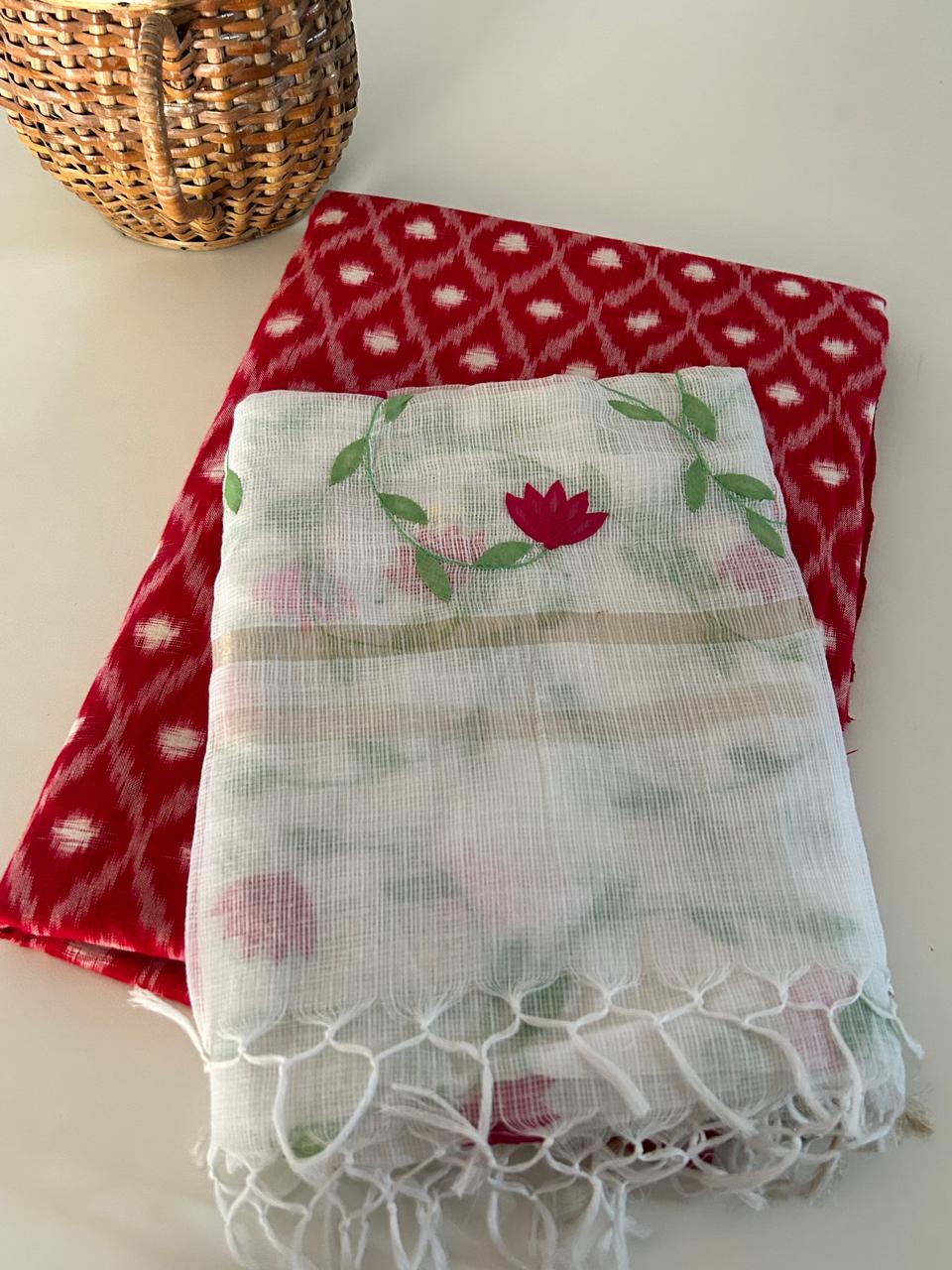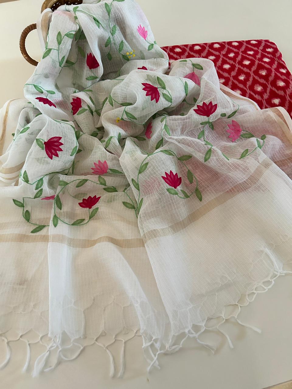 Dupatta: Pure Kota Doria with Hand-Embroidered Lotus Vines, 2.5 metres